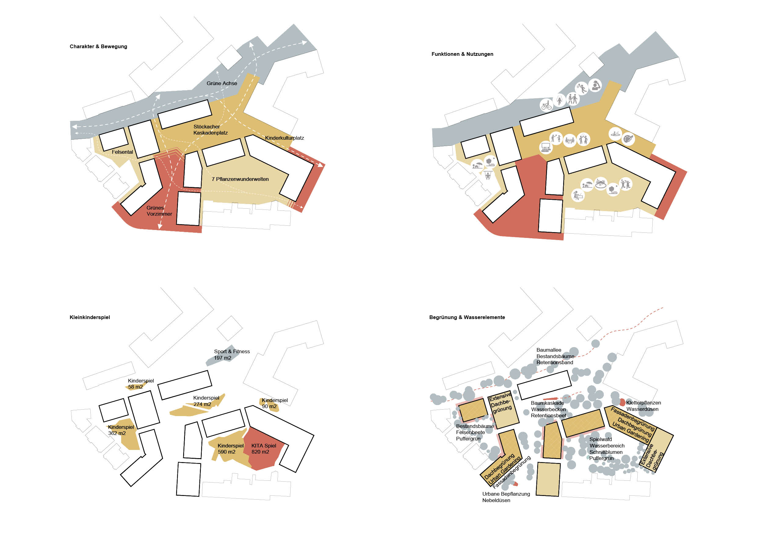 Gemäß dem Freianlagenkonzept wird im Entwurf spezieller Fokus auf die Ökologische, Soziokulturelle und Ökonomische Nachhaltigkeit gelegt. In den Höfen und auf den Dächern finden sich Naturschutzmaßnahmen zur Förderung der Biodiversität wieder. Klimasensible Gestaltung, Fassadenbegrünung und Regenwassermanagement fließen in den Entwurf mit ein. Besonderer Fokus liegt auf Recyclingprozessen bestehender Abbruchelemente vor Ort. Es werden z. B. Ziegel so aufbereitet, dass sie für Dachsubstrat verwendet werden können und Asphalt und Beton für Terraway-Beläge.