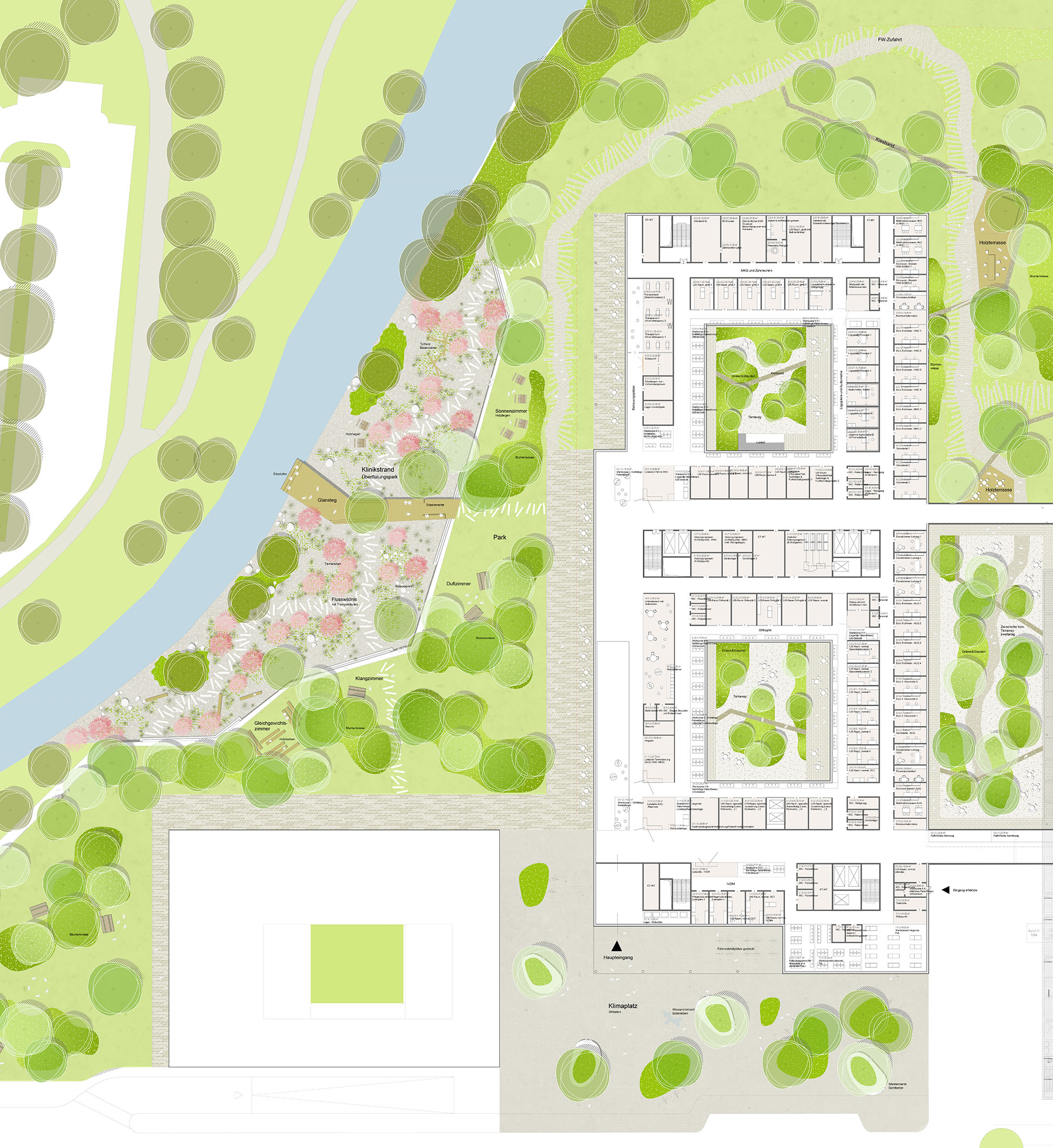 Der Freiraumentwurf fördert die Biodiversität durch eine vielfältige heimische und standortgerechte Vegetation, darunter artenreiche Blumenwiesen, Gehölz- und Staudenpflanzungen, Wildobstgehölze, bepflanzte Retentionsmulden auf dem Klimaplatz, Kleinstrukturen aus Steinen und Holz sowie großzügige Fassaden- und Dachbegrünungen. Diese Maßnahmen tragen dazu bei, die biologische Vielfalt zu steigern und unterstützen bei der Ansiedlung neuer oder heimischer Tierarten. Blüten- und nektarreiche Gehölze und Stauden bieten Nahrungsmöglichkeiten.