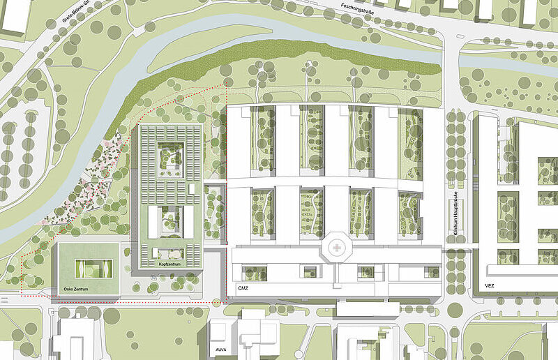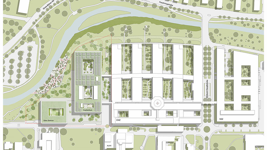 Das Klinikum Klagenfurt an Wörthersee wird um ein innovatives Kopfzentrum erweitert. Die Außenlangen führen das Arboretum Klagenfurt fort, das von idealice umgesetzte Gestaltungskonzept für das Klinikum und integrieren zeitgemäße, klimasensible Gestaltungselemente.