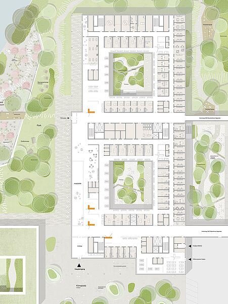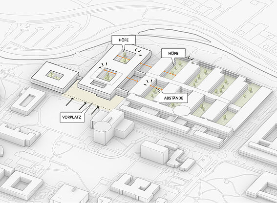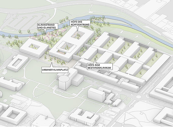Der urbane Klimaplatz bildet das Entree für das Kopfzentrum und das zukünftige Onkologie Zentrum. Der Untergrund des Platzes wird nach dem Schwammstadtprinzip ausgebildet, welches verbesserte Wasserversorgung für die Bäumen bietet und gleichzeitig die Dachwässer retendiert und so nachhaltig genutzt werden. Eine zusätzliche Kühlung entsteht außerdem durch ein Wasserelement. Grüninseln mit Sitzeinfassungen und angelagerten Fahrradabstellplätzen gliedern den Platz.