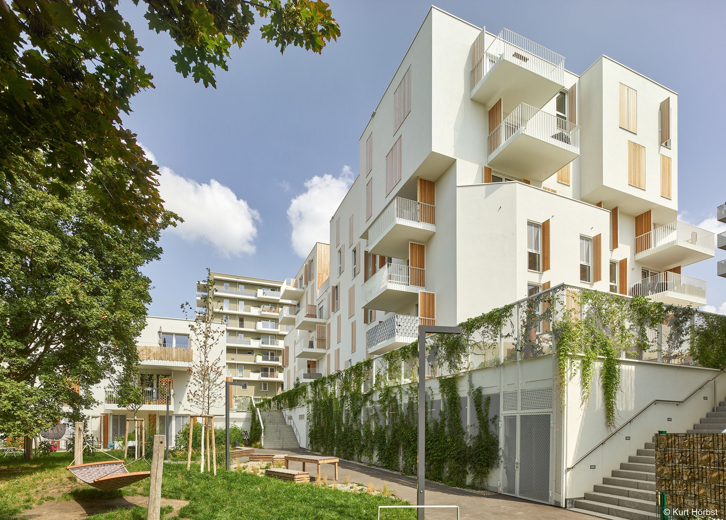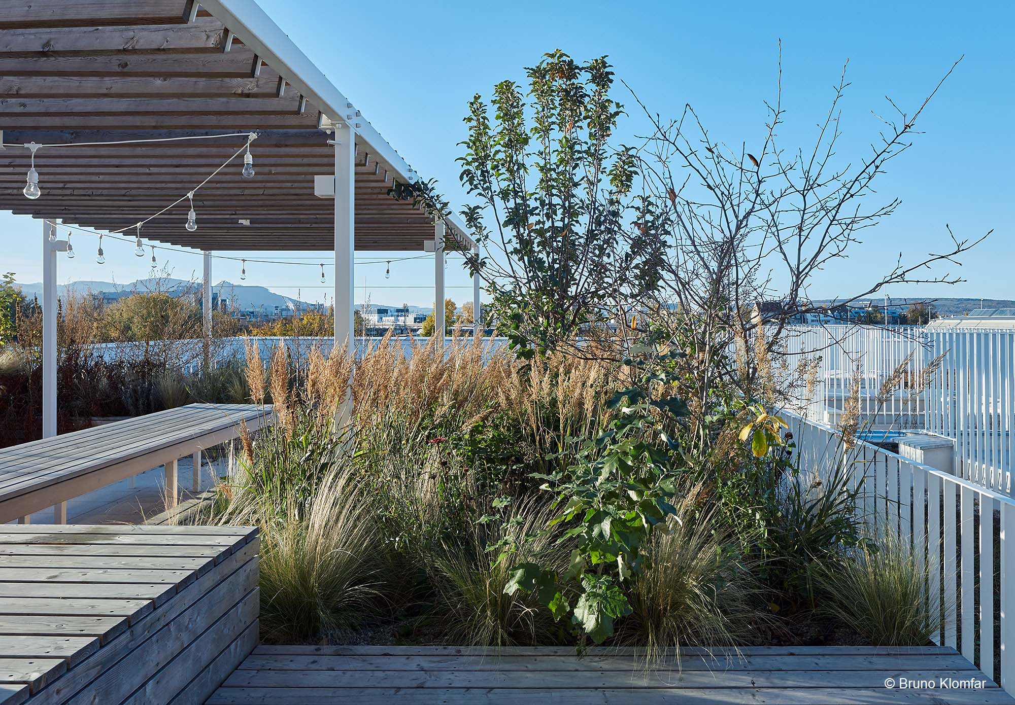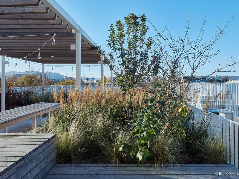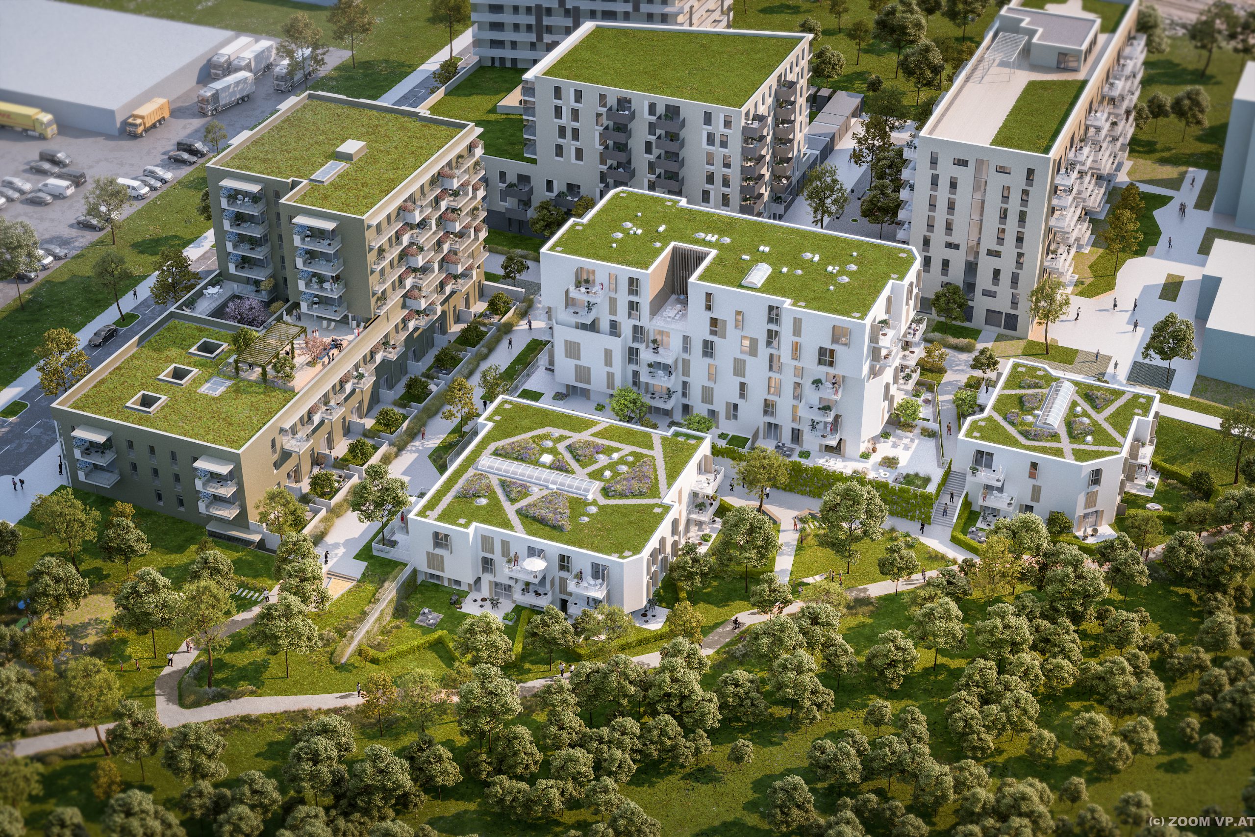 Besonderes Highlight sind die gestalteten Dachlandschaften auf zwei Häusern. In der Gestaltung wird die Formensprache der Hecken der Gärten im Erdgeschoß aufgegriffen. Bänder aus Kies ziehen sich durch eine extensive Bepflanzung. Vereinzelte Pflanzhügel ermöglichen auch eine Bepflanzung mit Gräsern und Stauden.