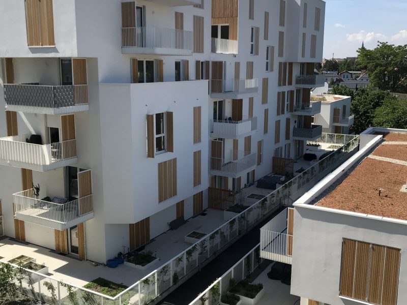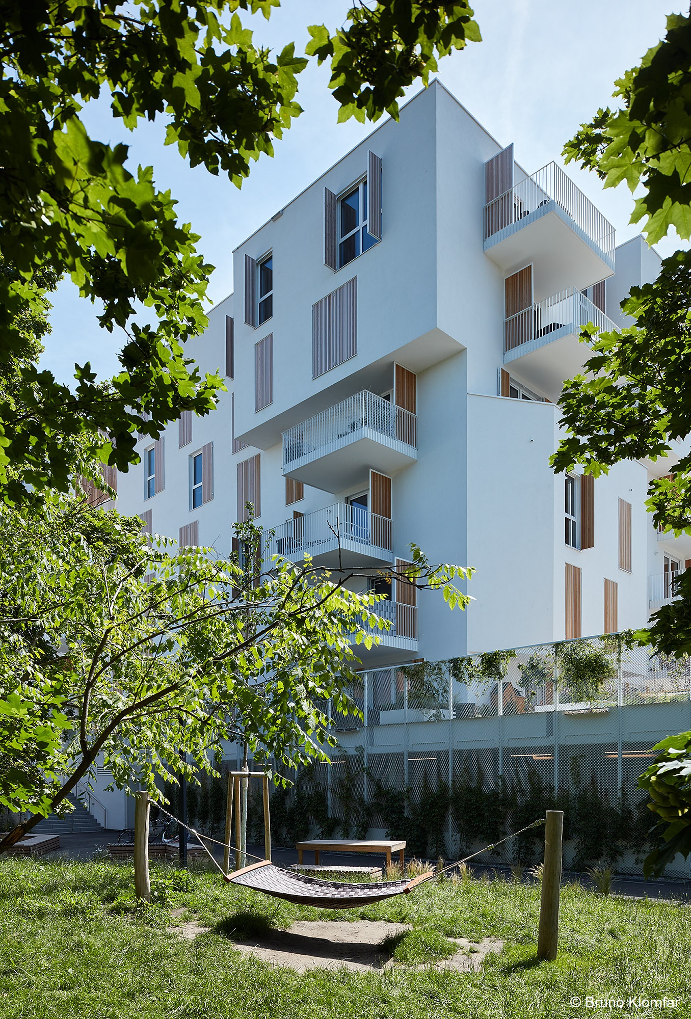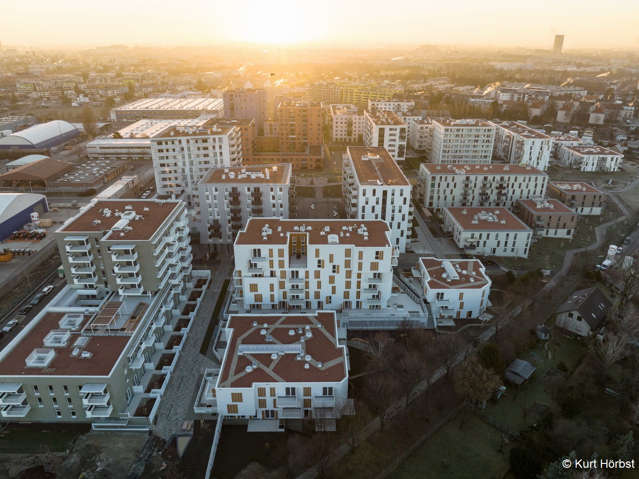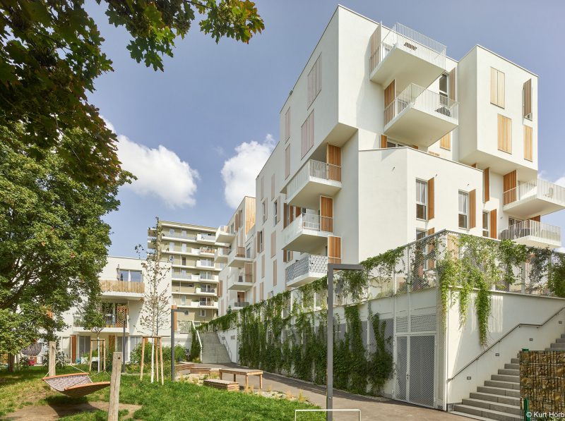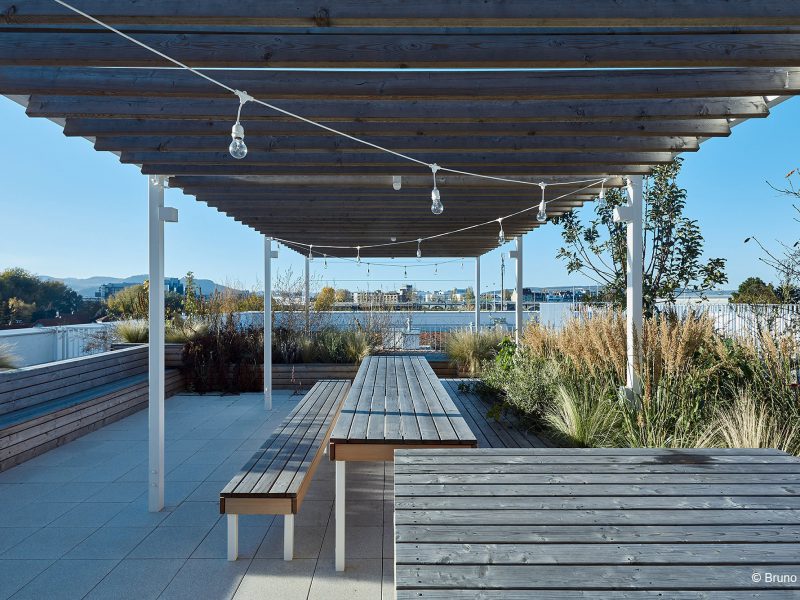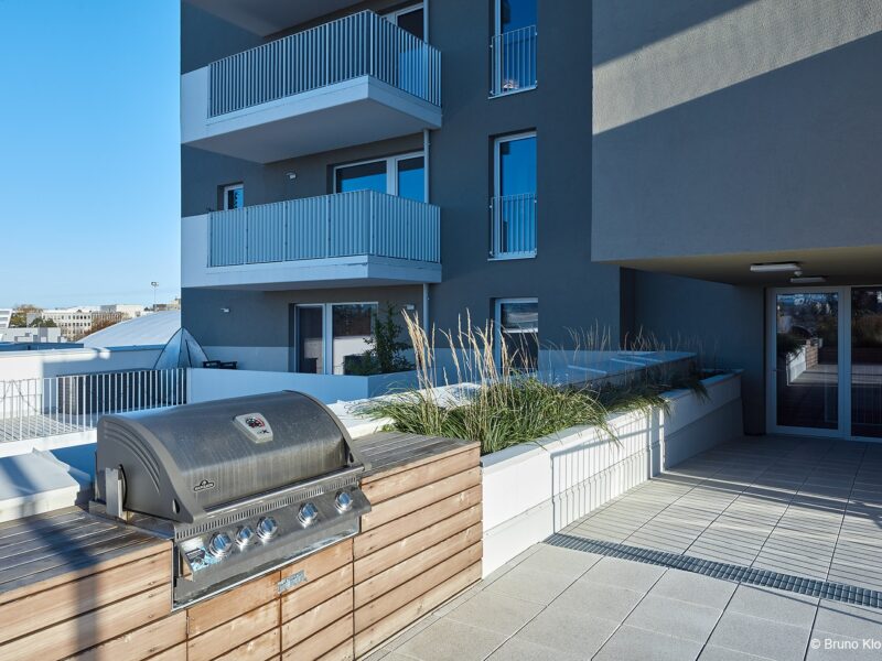 Besonderes Highlight sind die gestalteten Dachlandschaften auf zwei Häusern. In der Gestaltung wird die Formensprache der Hecken der Gärten im Erdgeschoß aufgegriffen. Bänder aus Kies ziehen sich durch eine extensive Bepflanzung. Vereinzelte Pflanzhügel ermöglichen auch eine Bepflanzung mit Gräsern und Stauden.