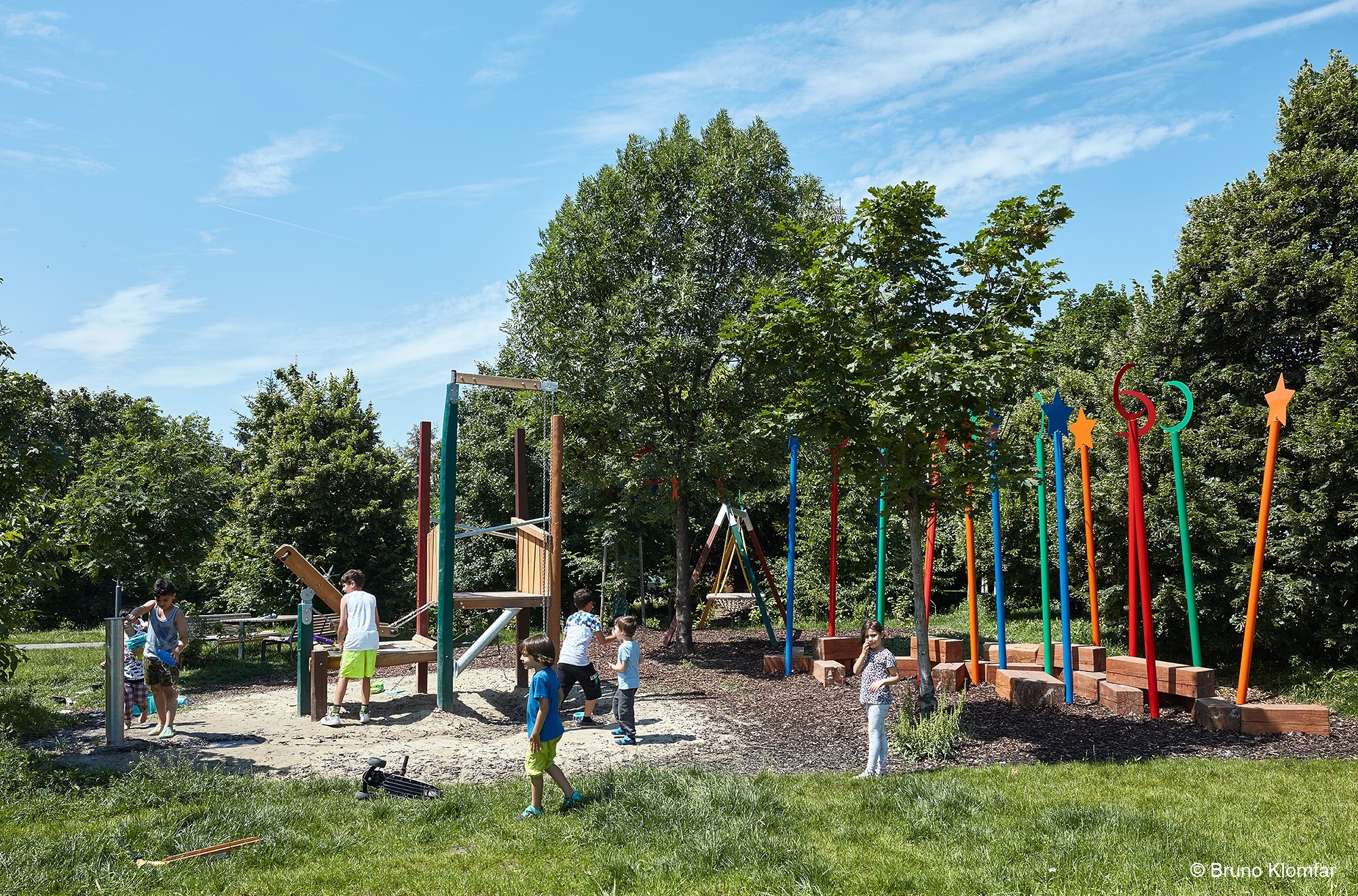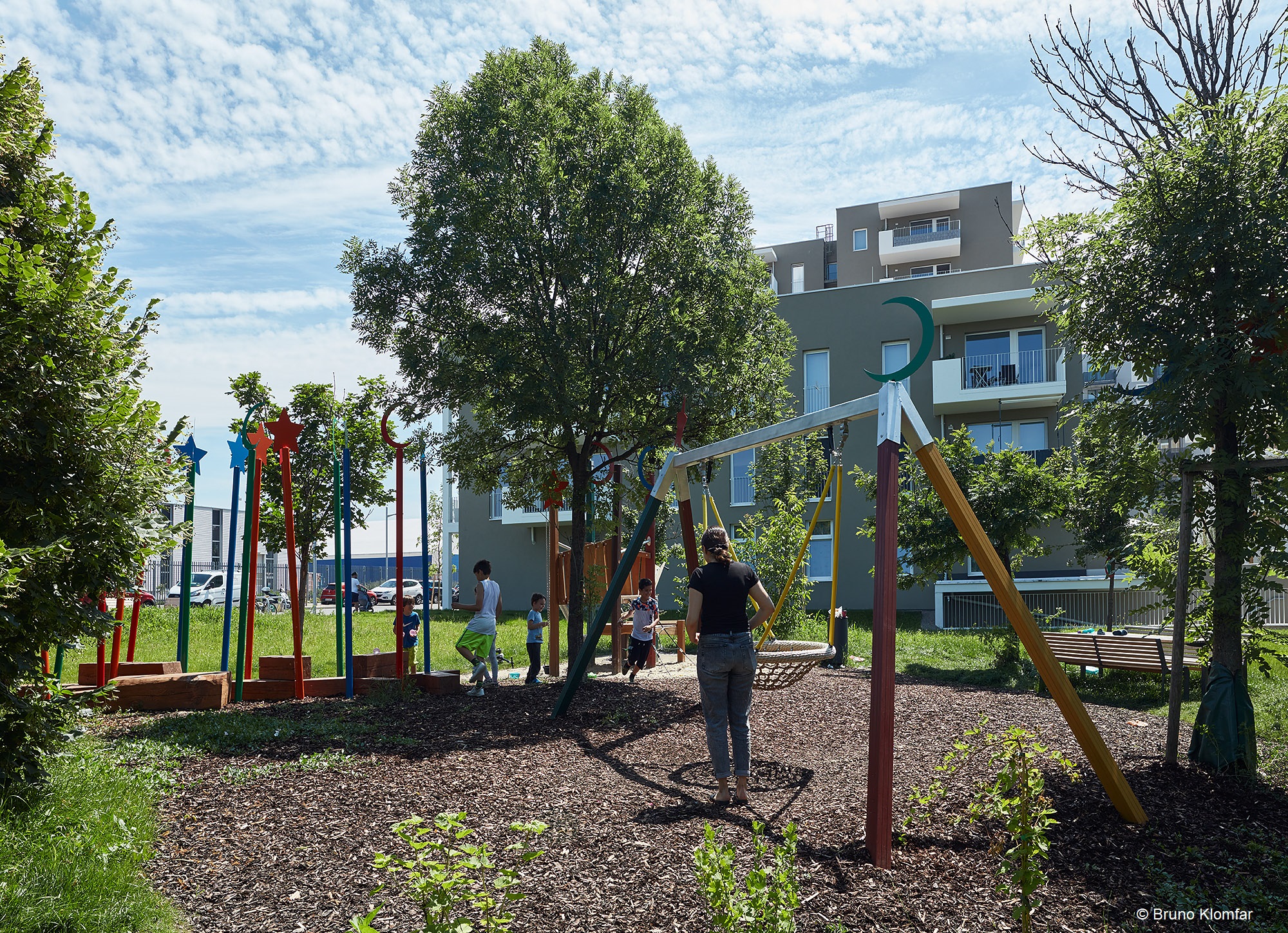 Zwischen den großen, schattenspendenden Bäumen eingebettet befinden sich zwei weitere Spielinseln. Im Zaubergarten trainieren Kinder ihren Gleichgewichtssinn und toben sich in der Mud Kitchen kreativ aus. Naschkatzen bedienen sich an den umliegenden Beerensträuchern. Ein mit Wiesenkräutern bepflanzter Hügel schirmt den Spielbereich von der Leopoldine Padaurek Straße ab. Der Märchenwald fördert die Phantasie der Kinder. Über ein Weidenlabyrinth gelangen kleine AbenteuerInnen zu einem Turm mit Rutsche. Die Mutigen probieren sich an Slacklines, die an den Bestandsbäumen angebracht sind.