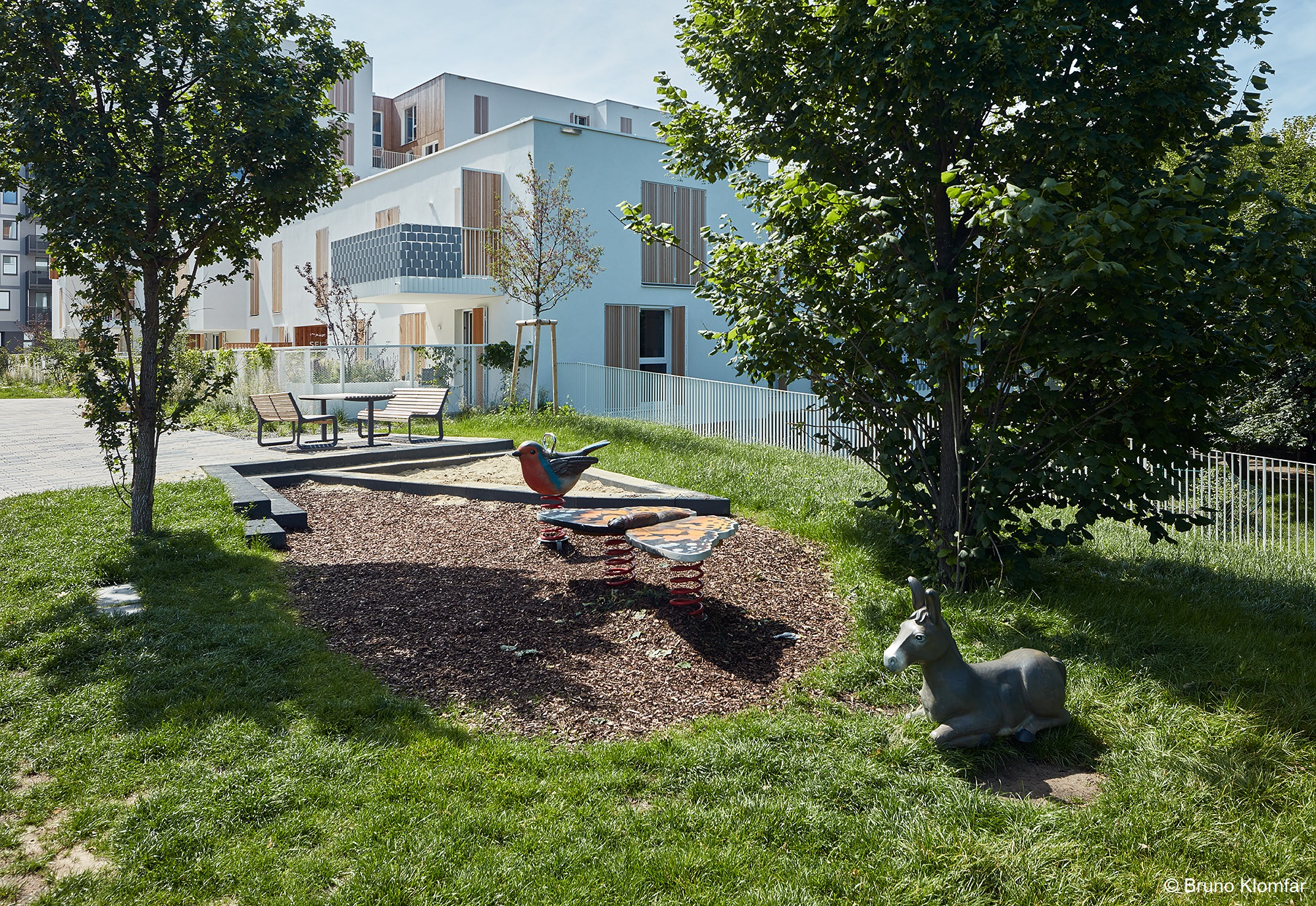 Siemens A1 (Poldine) und A2 (Selma) sind die westlichsten Bauplätze des neuen Stadtquartiers Siemensäcker. An den öffentlichen Durchgang angelagert befindet sich Richtung der bauplatzbezogenen Freiräume der gemeinsame Kleinkinderspielplatz mit Sandkiste und Eselchen aus Holz. Diese Tierart stellt einen Bezug zu den spanischen Architekten des Bauplatzes A2 her. Ein Esel namens Platero ist einer der beiden Hauptcharakter eines spanischen Märchens.