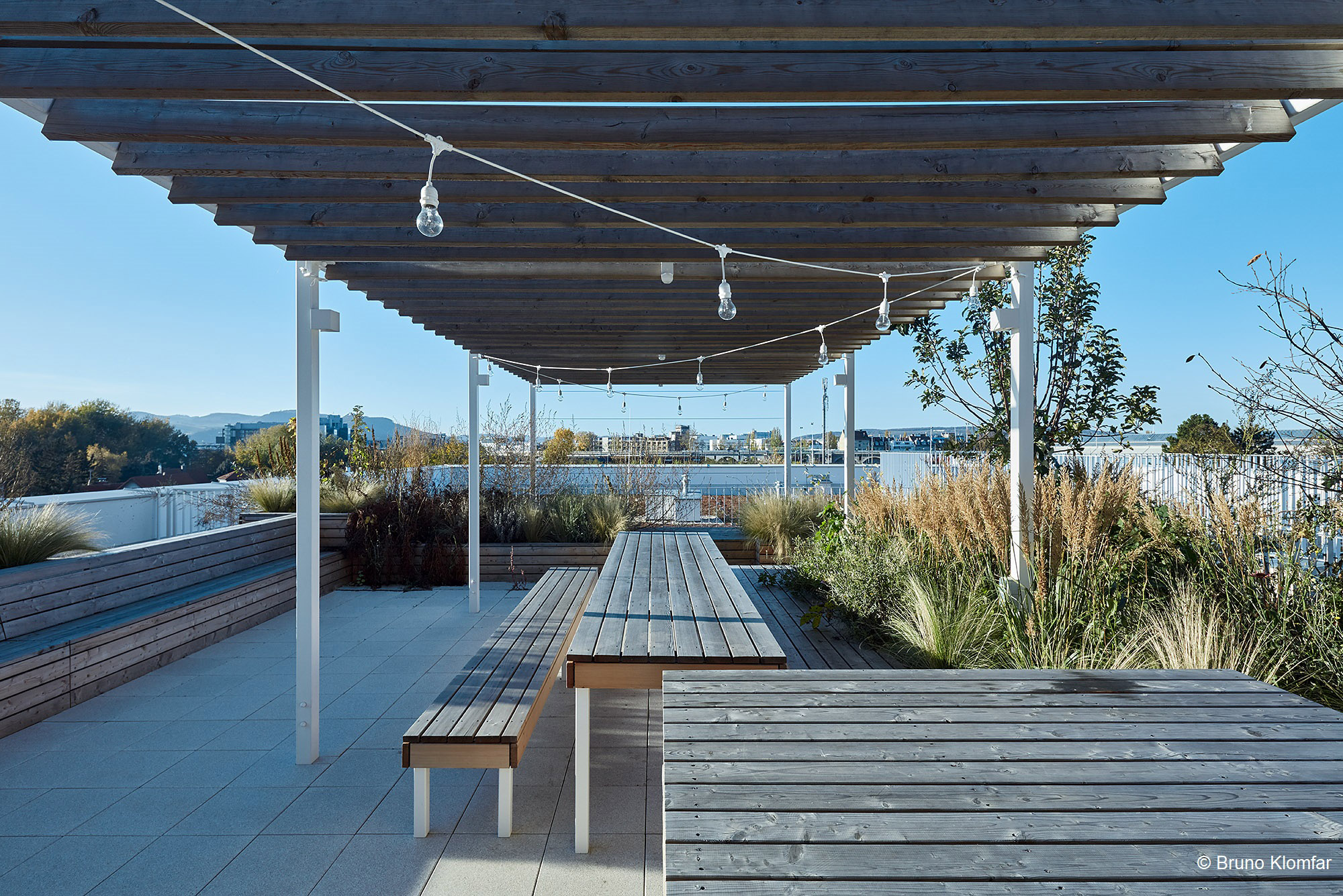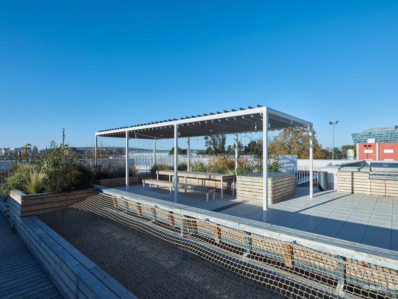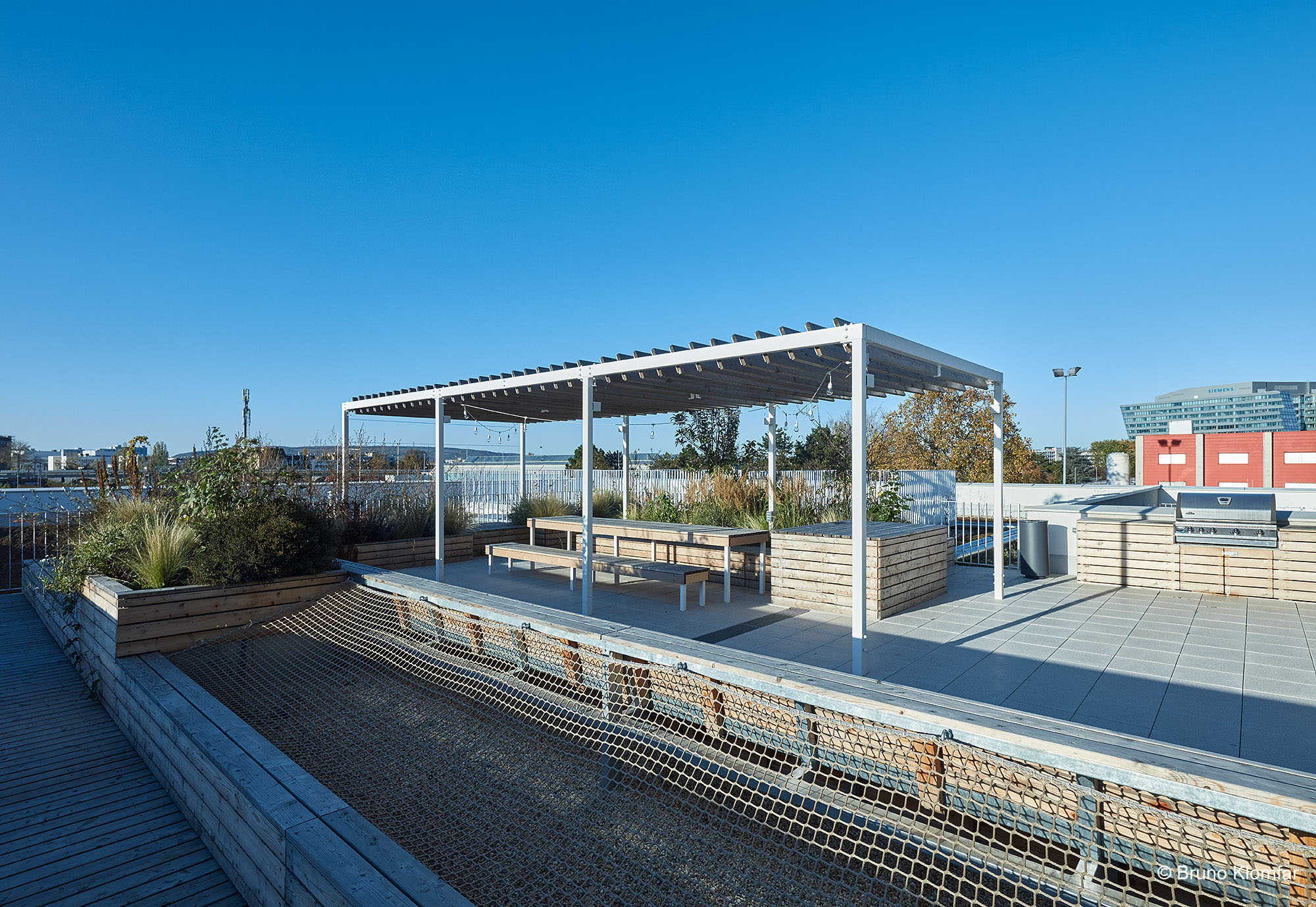 Im OG 3 befindet sich eine Dachterrasse. Outdoorkitchen mit Grill und eine lange Tafel unter einer Pergola ladet zu gemeinsamen Festen ein. Ein besonderes Highlight ist die Holzlounge mit zwei Ebenen und einem integrierten Liegenetz. Zwei mehrstämmige Judasbäume mit beindruckenden lilafarbenen Blüten finden Platz in eingepassten Pflanztrögen.