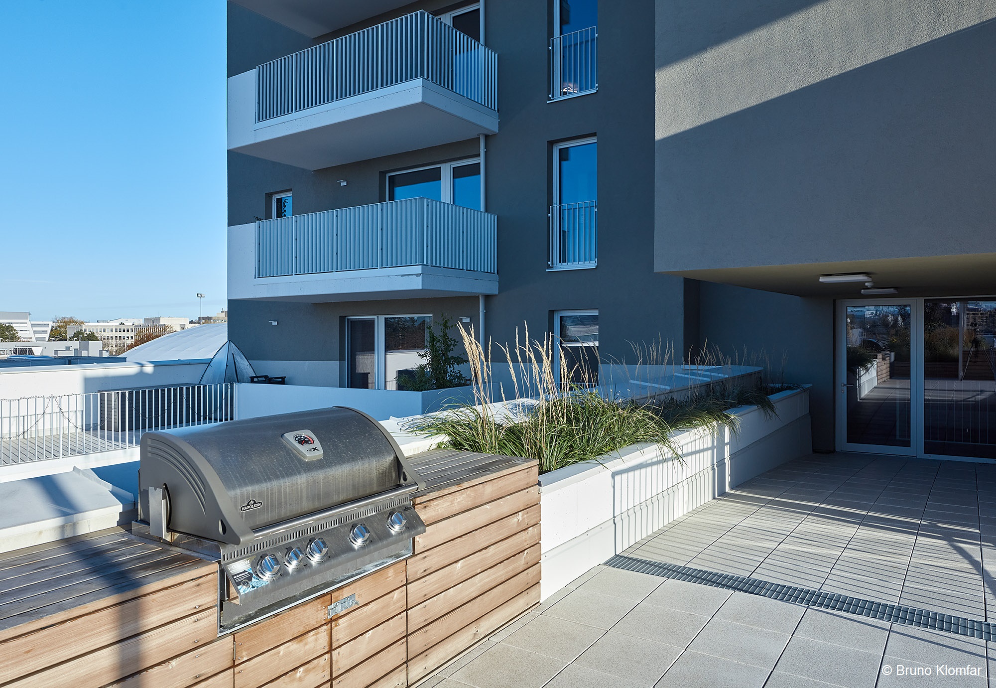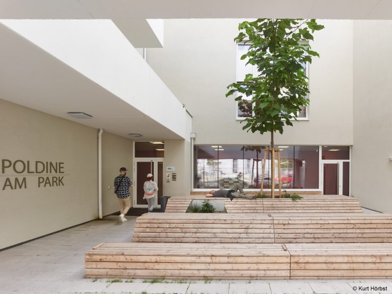 Im Haupteingangsbereich von Wohnhaus A1 ist ein multifunktionales Sitz- und Liegeelement, die sogenannte „Welle“ ein Blickfang. In das Wellen schlagende Holzelement sind Pflanzbeete integriert. Der mehrgeschossige Luftraum ermöglicht auch eine Baumpflanzung inmitten des Gebäudes. Ein Blauglockenbaum thront über der Welle.